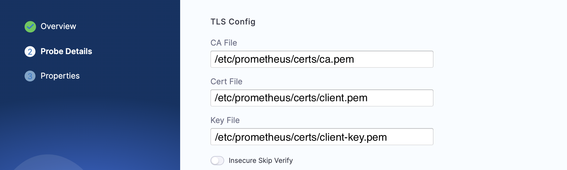 - Insecure Skip Verify: If enabled, the probe bypasses the SSL/TLS certificate verification, allowing requests to proceed even if the certificate is invalid or self-signed.