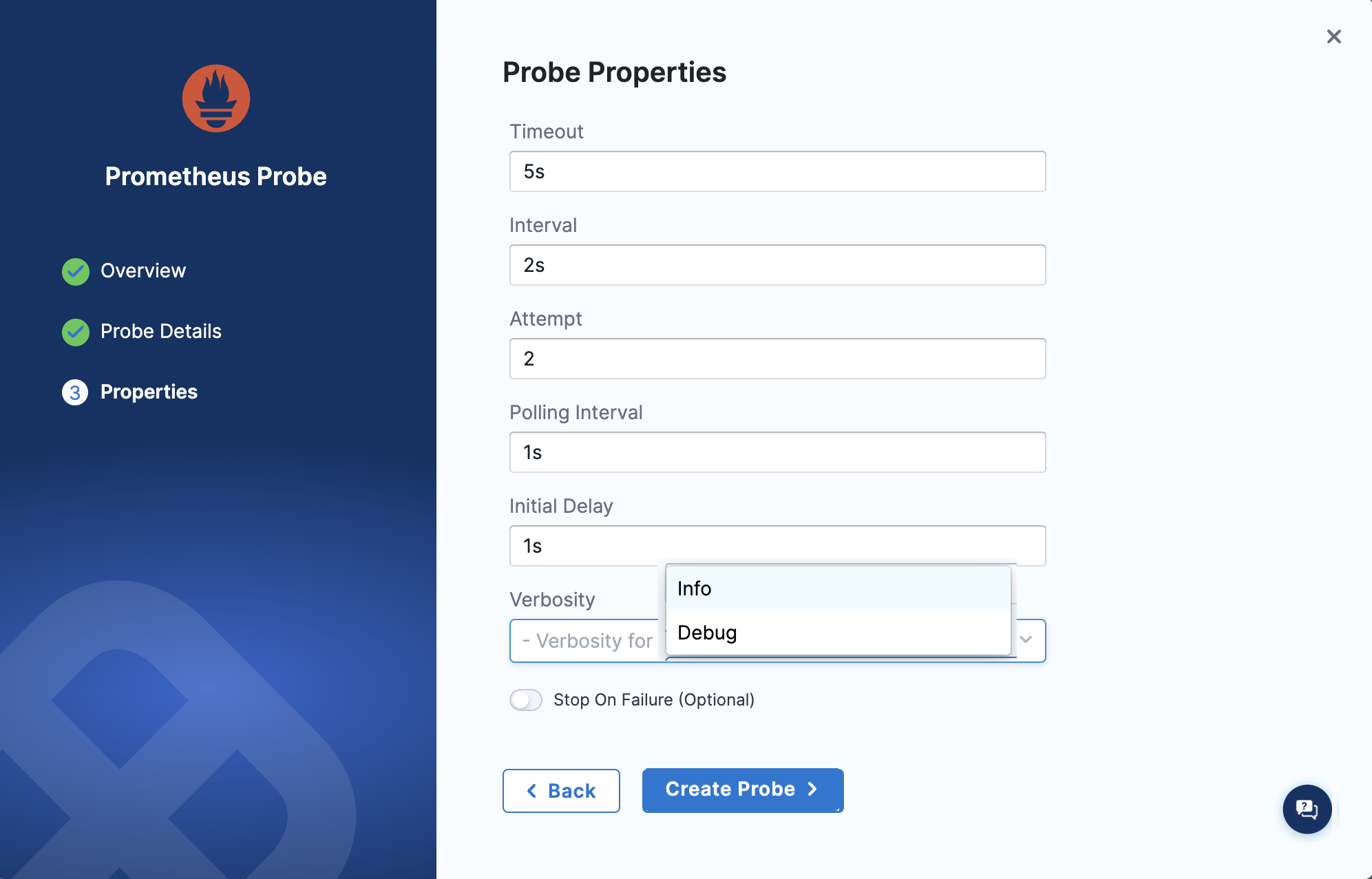 info(essential logs, probe status are printed) anddebug(in-depth logs, timestamps, and execution logs are printed) mode. - Stop on Failure (Optional): Enable it to continue or disable it to stop the experiment execution after the probe fails. Disabled by default.