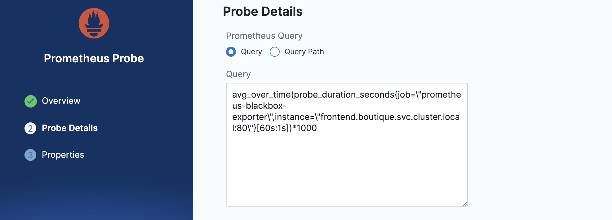 - Query: The PromQL query used with the probe to fetch the desired Prometheus metrics. Ensure that the strings inside the query are enclosed within backslash ("/"). This field is mutually exclusive with Query Path field.