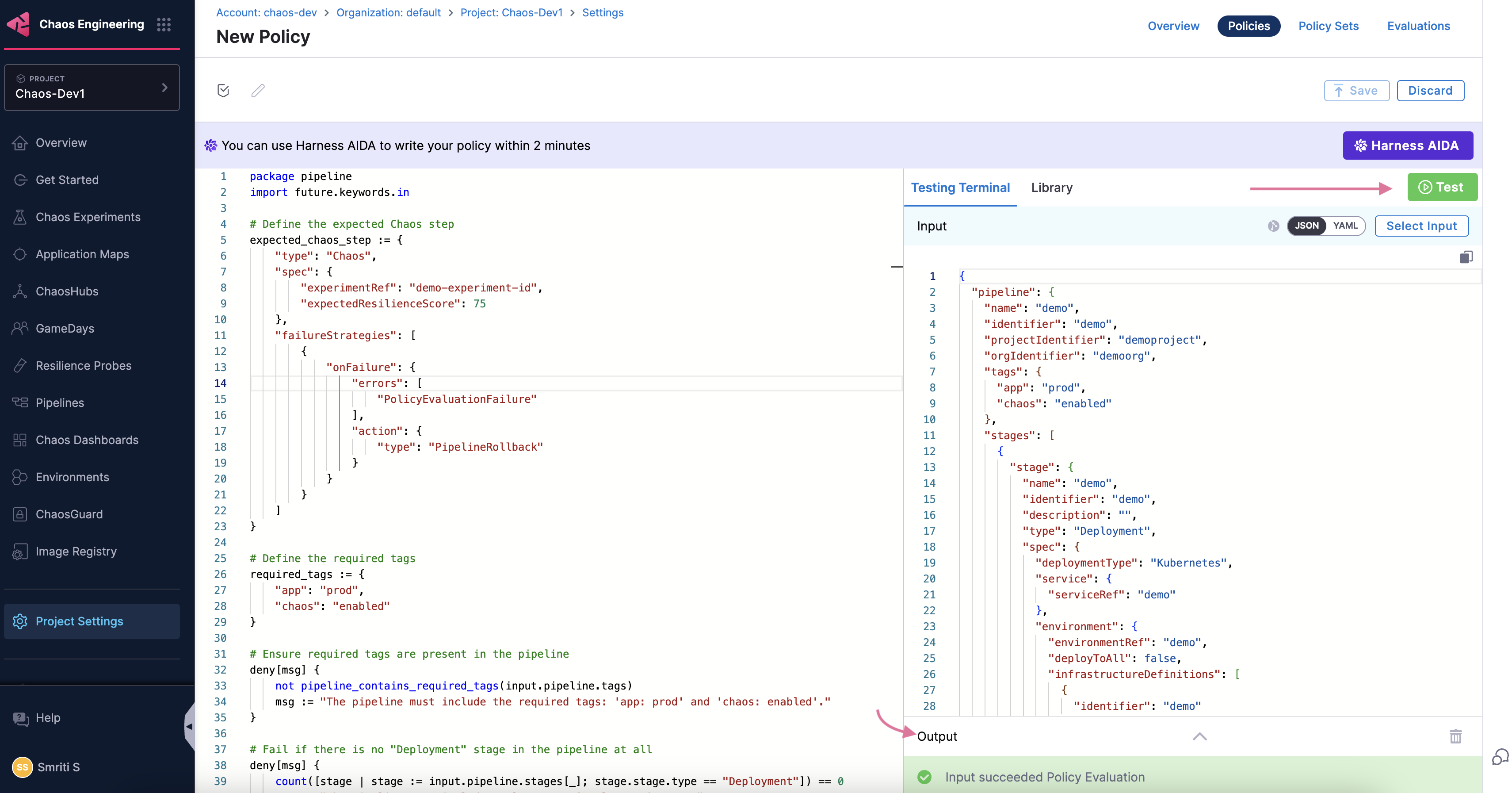 Integrating OPA with Harness Chaos Engineering pipelines allows you to enforce custom policies when executing chaos experiments. This ensures that only experiments whose associated policy was successful is executed, thereby enforcing compliance and security.