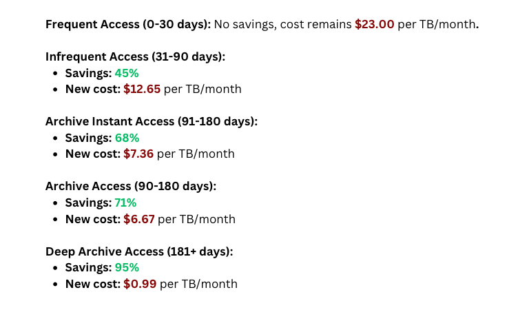 - Infrequent Access Tier: Data not accessed for 30 days moves here, saving approximately 45% compared to standard S3 storage.