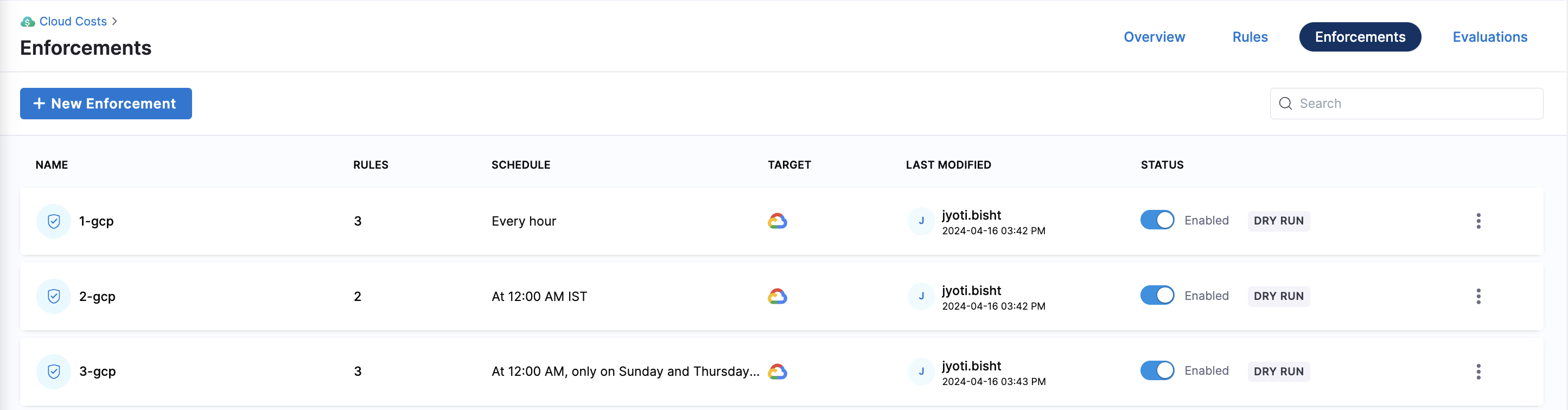Enforcements enable you to enforce a certain set of Rules or Rule Sets (also known as governance guardrails) against a specific set of targets (accounts, projects, or subscriptions) to run periodically. Sometimes, we need rules to run periodically, such as every day, week, or month. However, running these rules manually every day or week at a specified time creates extra overhead and is a slow process prone to manual errors. To solve this, you can use Enforcements that allow you to set up a timely schedule and choose the day, time, and frequency for their rules or rule sets.