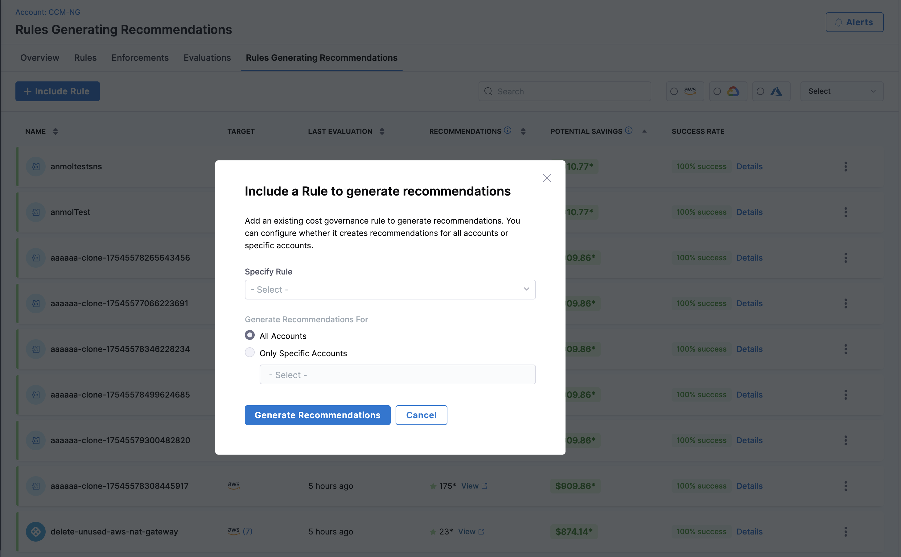 1. Click on "Rules Generating Recommendations" tab. Click the +Include Rule button to add an existing cost governance rule