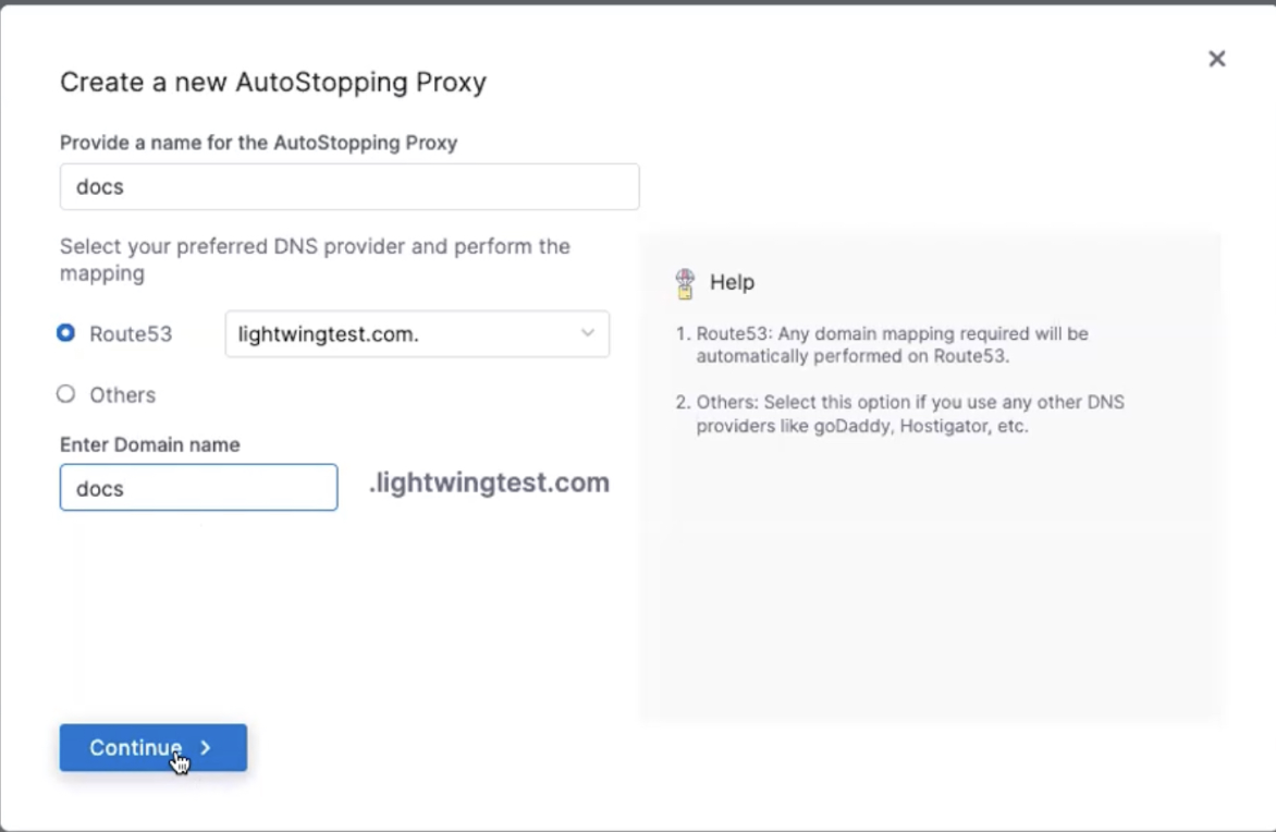 • If you select Route 53, you must choose a hosted zone from the available zones and enter the domain name. AutoStopping manages Route 53 configuration automatically. To know more about Route 53, go to Amazon Route 53.