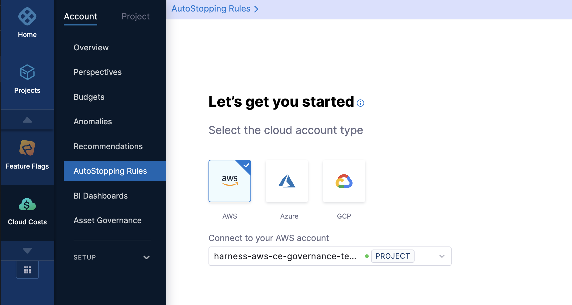 2. In the cloud account type, select AWS. It is the cloud account in which your workloads are running that you want to manage using AutoStopping rules.