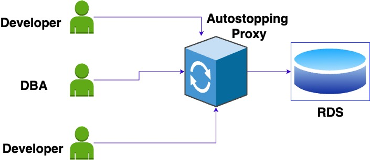 Harness AutoStopping Proxy provides an effective solution to reduce non-production cloud costs with minimal setup requirements and without causing disruptions for developers and other users. By onboarding your RDS instance or cluster to AutoStopping using the proxy, you will incur costs for the RDS only when it is actively utilized. Moreover, when the RDS instances are not in use, they are automatically stopped, further optimizing your cloud expenditure. The following diagram illustrates how you can use a proxy to enforce an AutoStopping rule on the RDS instance or cluster: