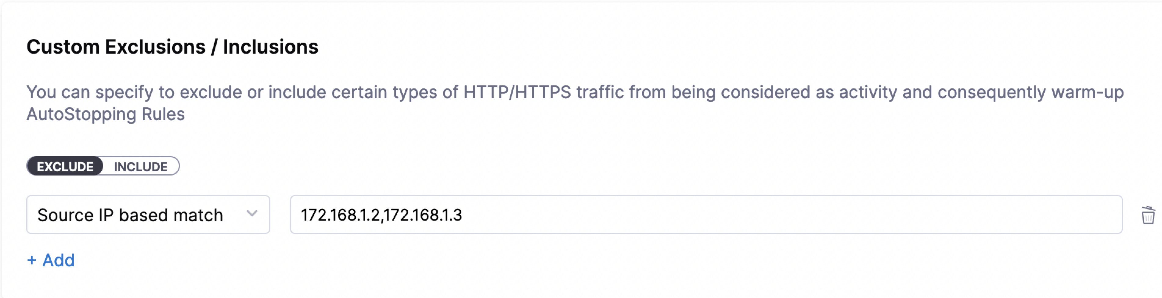 Custom exclusions and inclusions allow you to keep the cloud resources managed by AutoStopping remain idle by defining rules. These rules prevent the cloud resource from detecting traffic by the AutoStopping rule. For example, you can use custom exclusions and inclusions to filter out repeated traffic such as health checks, which would otherwise keep the cloud resource active at all times. The minimum idle time for the exclusion or inclusion-enabled AutoStopping rule is 15 minutes.