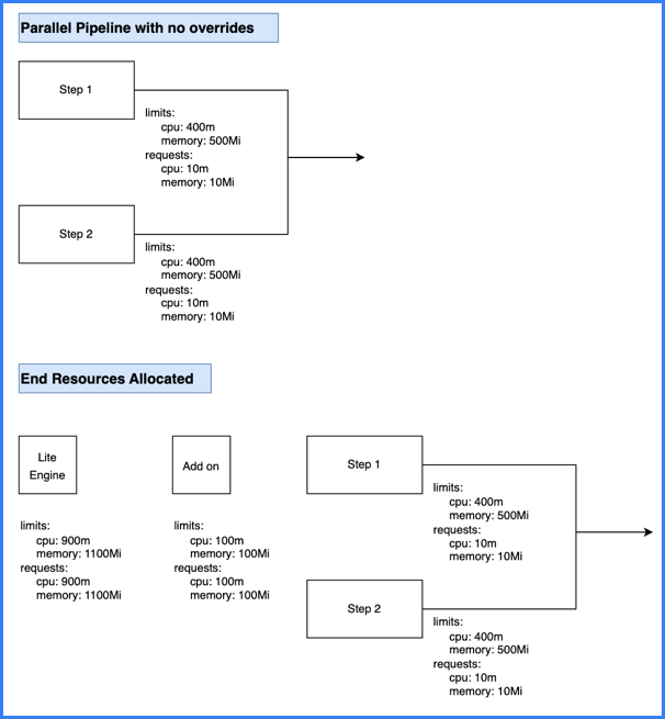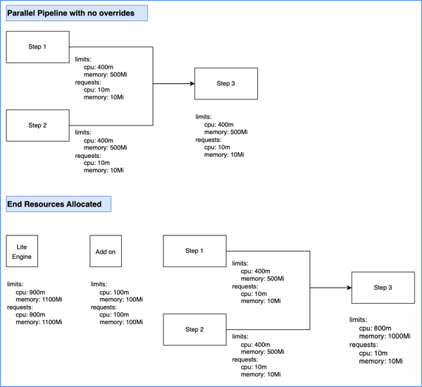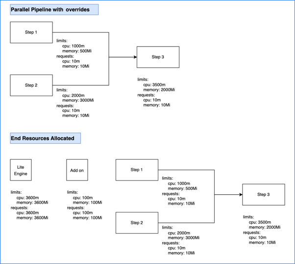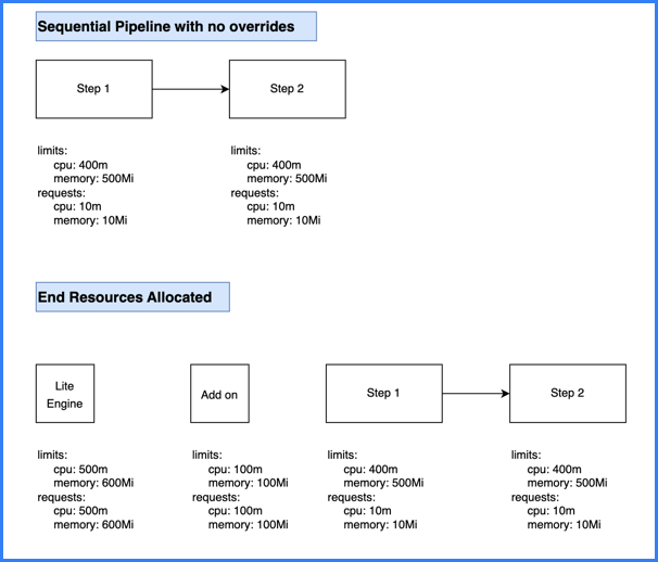 • The total stage (Lite Engine) resources for pipelines with sequential steps are calculated as ( maximum resources needed amongst sequential steps ) + ( add on resources ).