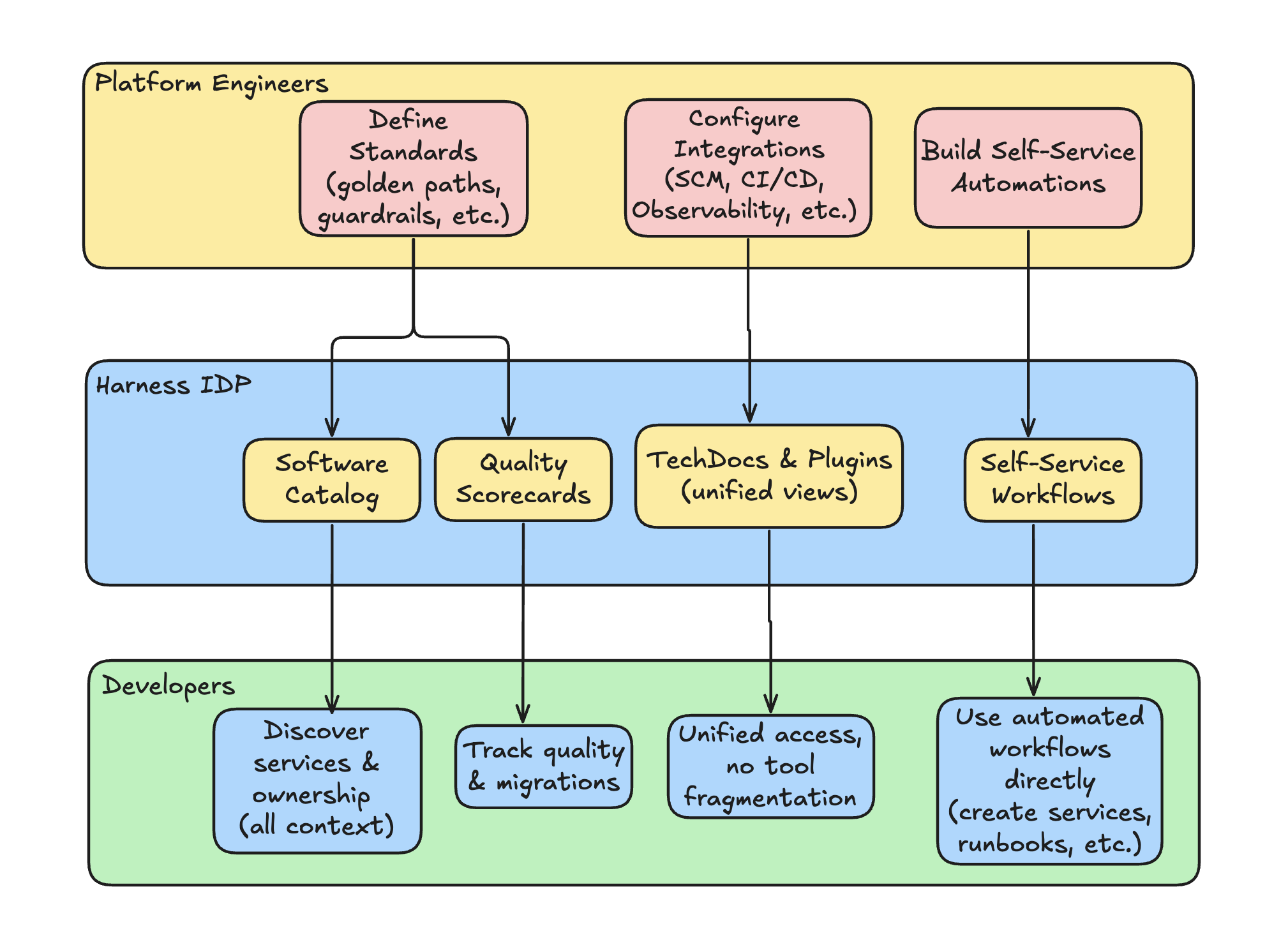 Harness Internal Developer Portal (IDP) is a unified platform that empowers developers to build, discover, and manage software while platform engineers automate standards and governance.