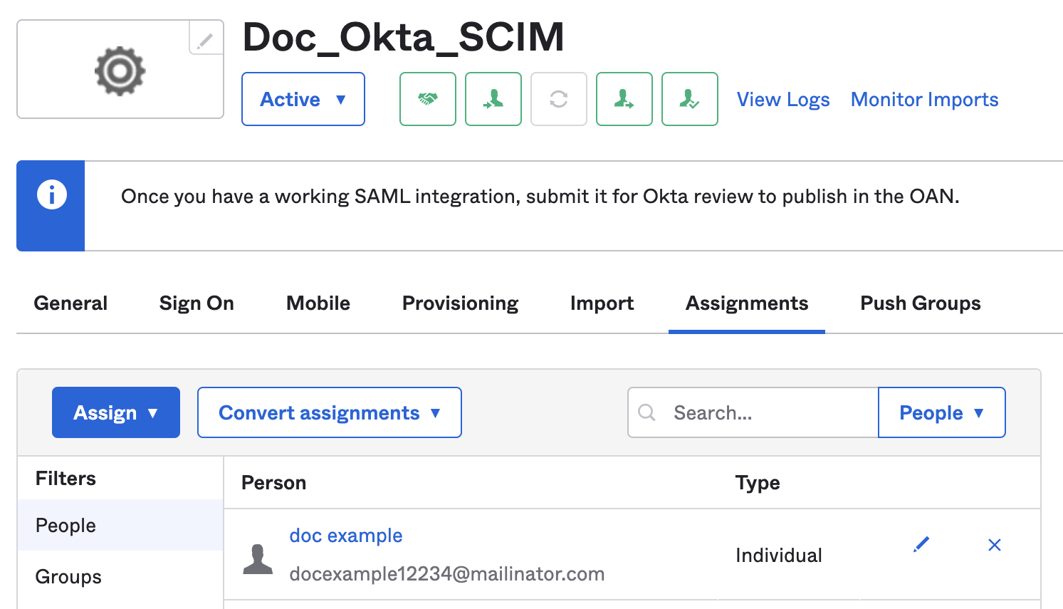• You must use Okta to delete Okta-provisioned users from Harness. To delete an Okta-provisioned user, remove them from the corresponding Okta app.