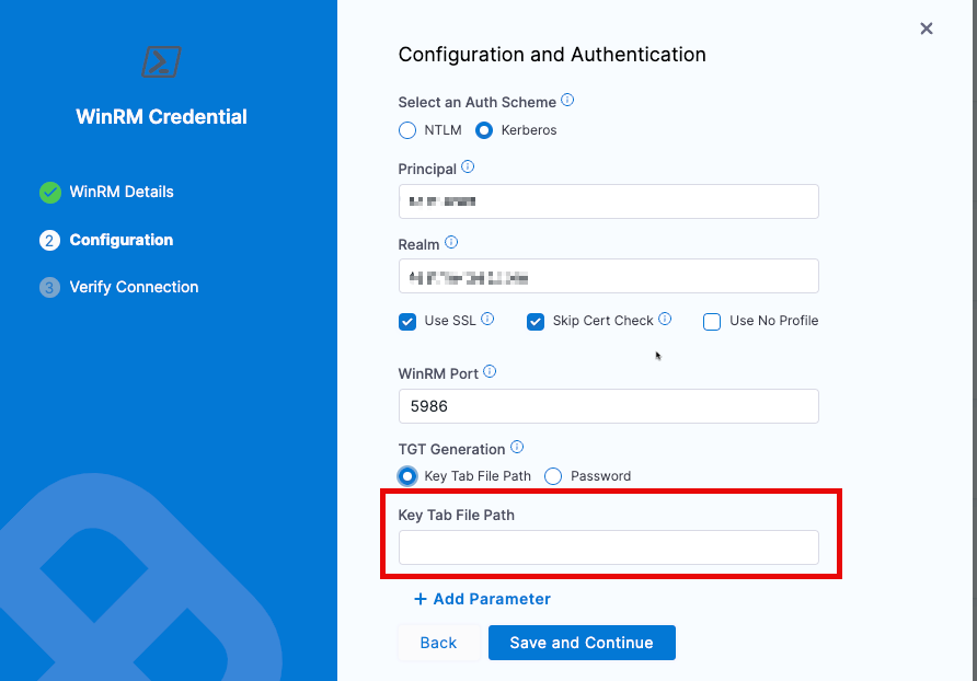 3. Password: Create or select an existing encrypted file secret that contains the relevant WinRM key file.