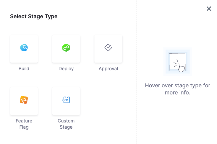 In Harness, open the pipeline, and then select Add Stage. The Select Stage Type settings open.