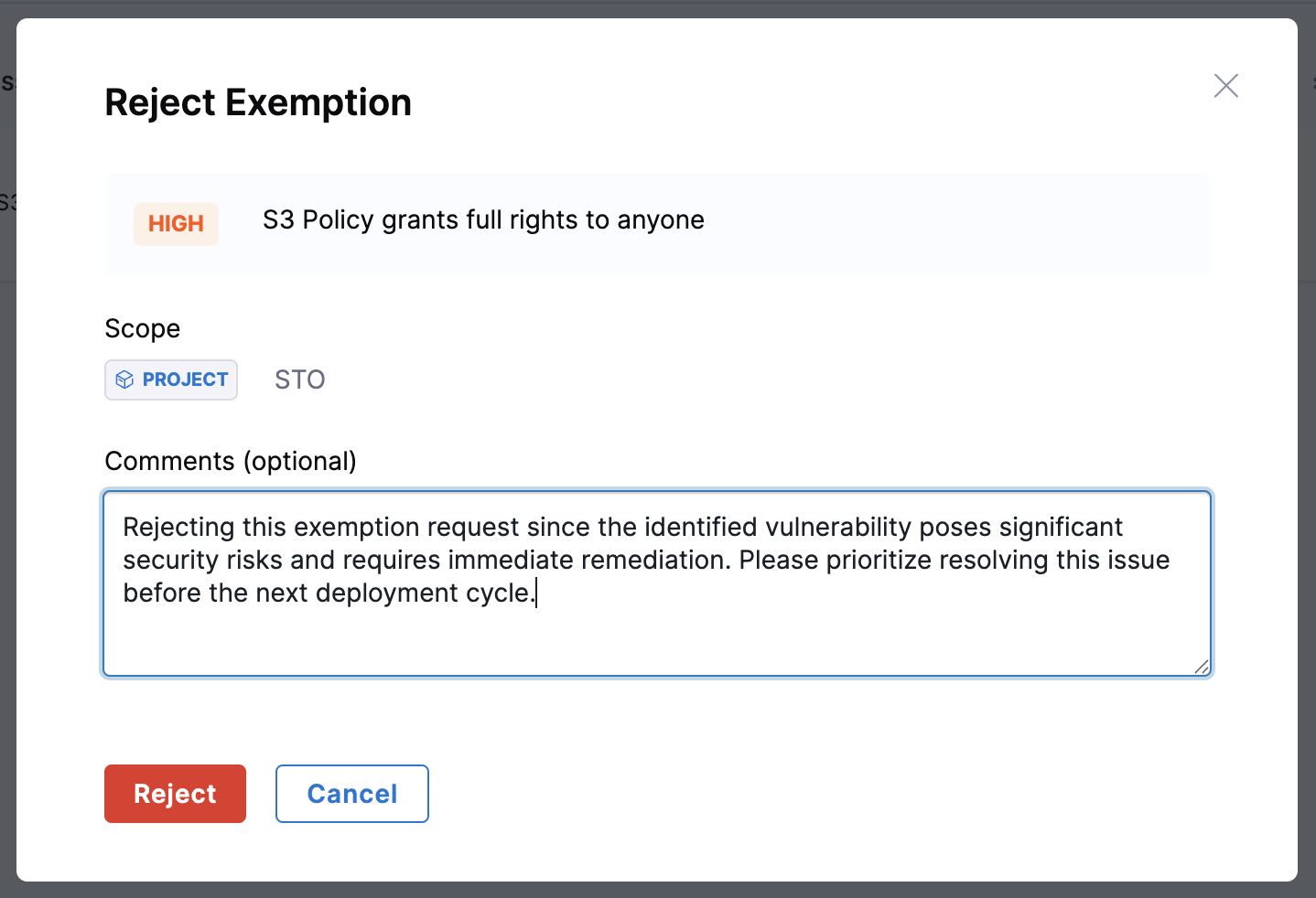 3. Rejected: The request has been reviewed and denied. The issue remains active, and the pipeline may continue to block due to OPA policy enforcement failures.