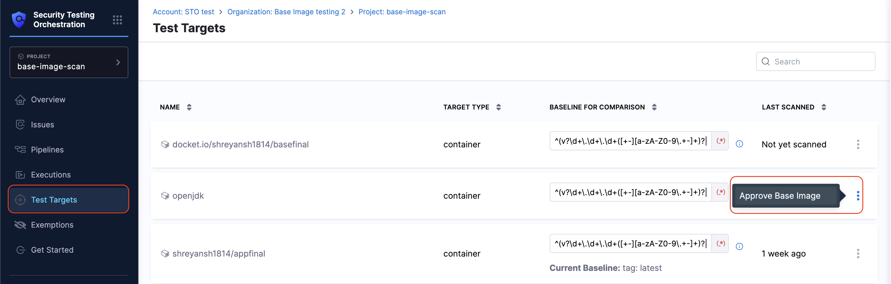 Before approving a base image, make sure you’ve reviewed What is Base Image Approval? and understood the process. To approve a base image, you must have the Approve / Reject permission for Test Targets in the project where you want to approve the base image. Or you must have the Security Testing AppSec role assigned. Refer to the RBAC documentation for more information.