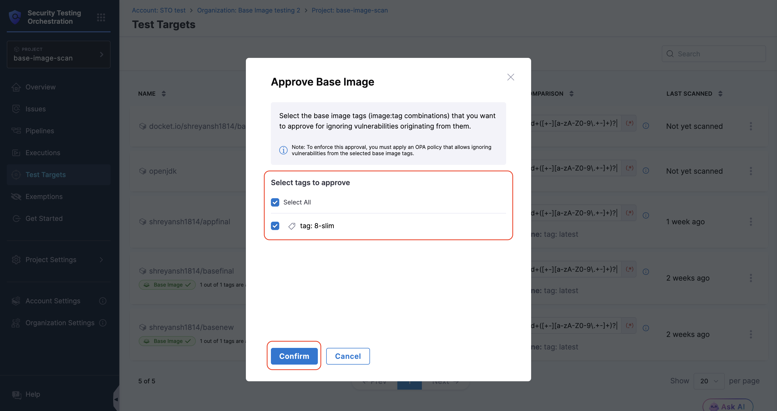 For example, the Base Origin might appear as: Base_Image_testing_2/baseimagescan/openjdk. This aligns with the format OrgName/ProjectName/TargetName. You can approve the base image in the baseimagescan project.