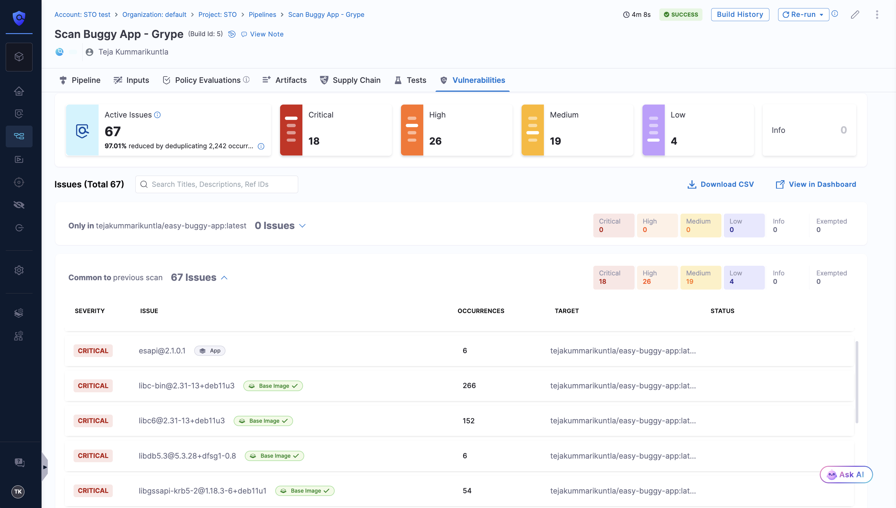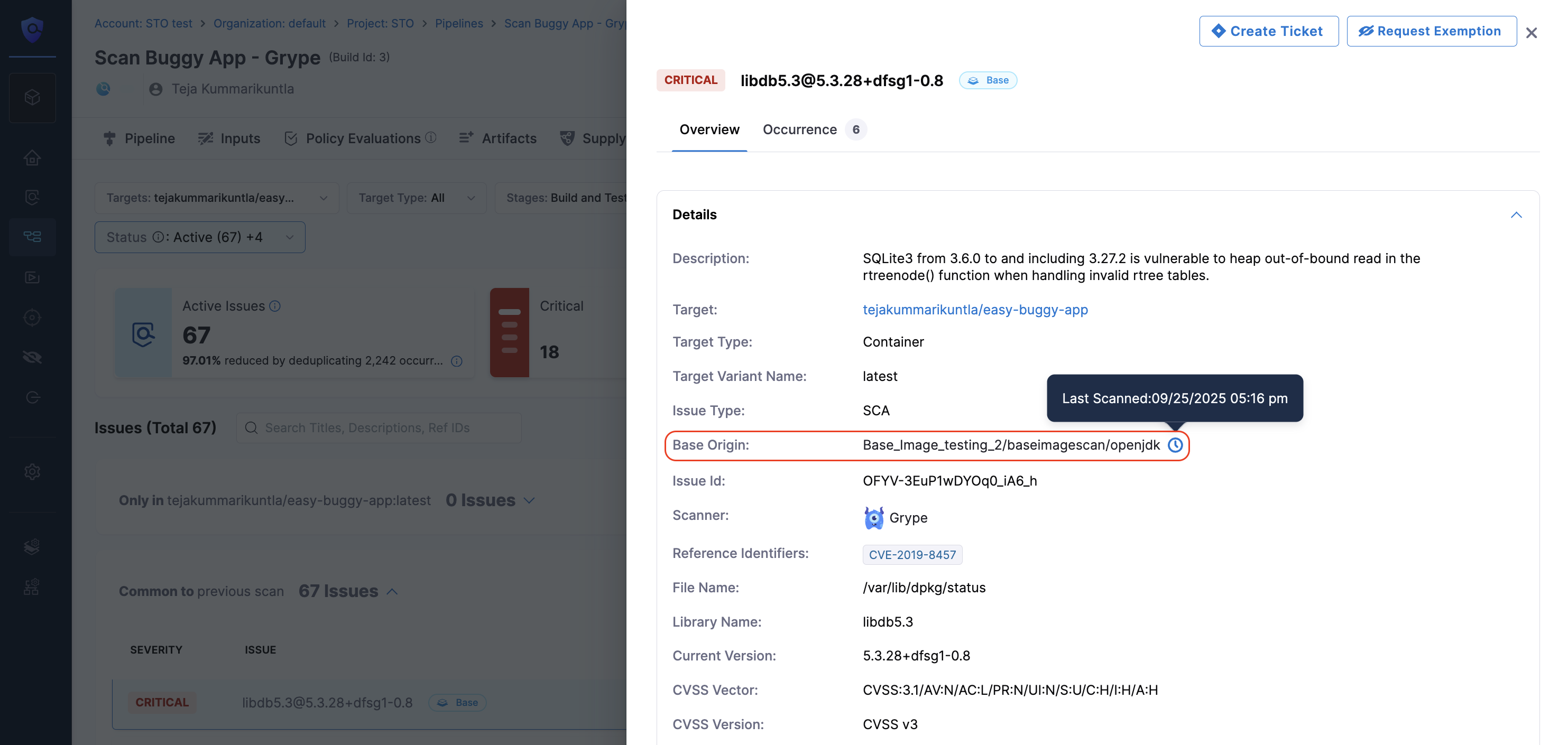 Base Imagelabel in the Vulnerabilities tab. Vulnerabilities from unapproved base images are marked in blue. - Step Output Variable: The