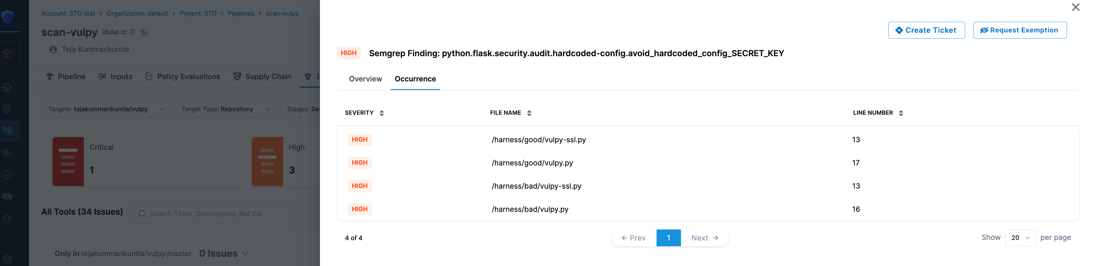 Remediation: Remediation steps from Harness AI and Scanner. If scanning a repository, you can raise PRs or get code suggestions from Harness AI (see Fix security issues using Harness AI).