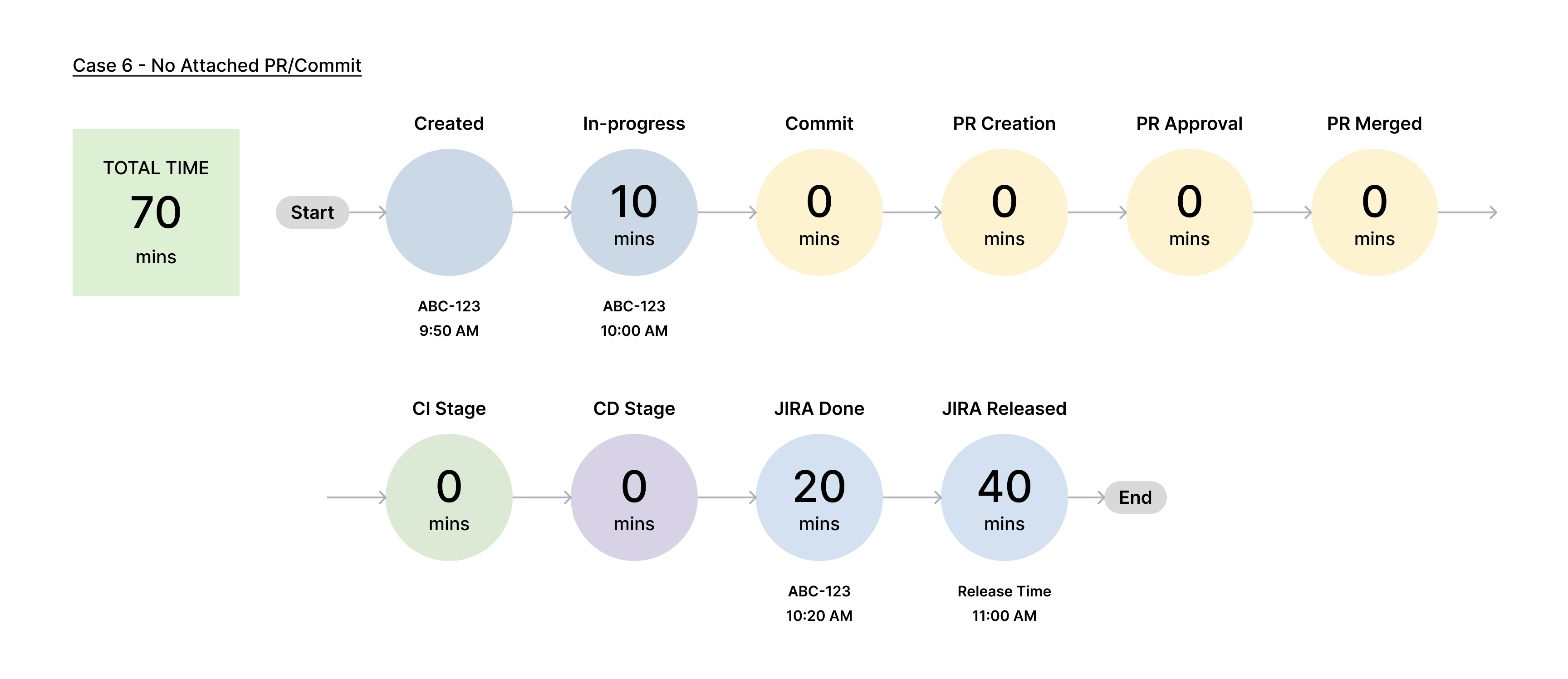 In this case, since there are no pull requests (PRs) or commits associated with the Jira ticket, several stages in the lead time calculation have zero values. The lead time calculation in this case gets computed based on the time taken for the ticket to move through the In Progress, Done, and Released states in the Issue Management System (e.g., Jira).