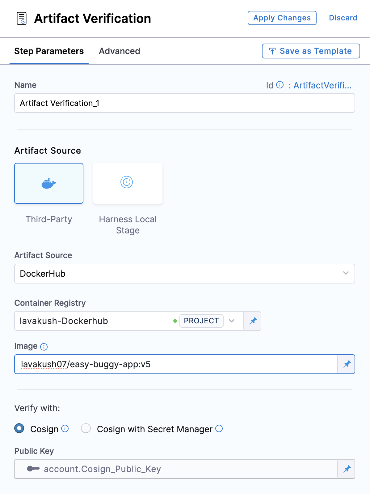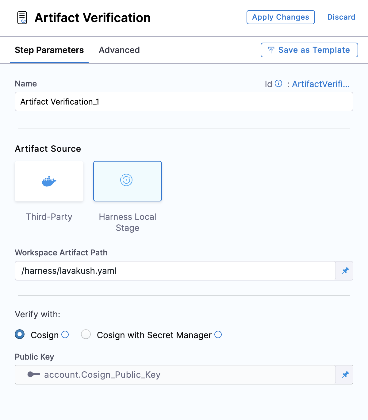 The Artifact Verification step pulls the .sig file from the artifact registry and verifies it with the corresponding public key. In the artifact signing step, if you have chosen not to push the .sig file to the registry, then for the artifact verification .sig file will instead be pulled from the Harness database. This process ensures that the artifact was signed by a trusted entity, thereby confirming its integrity and authenticity.